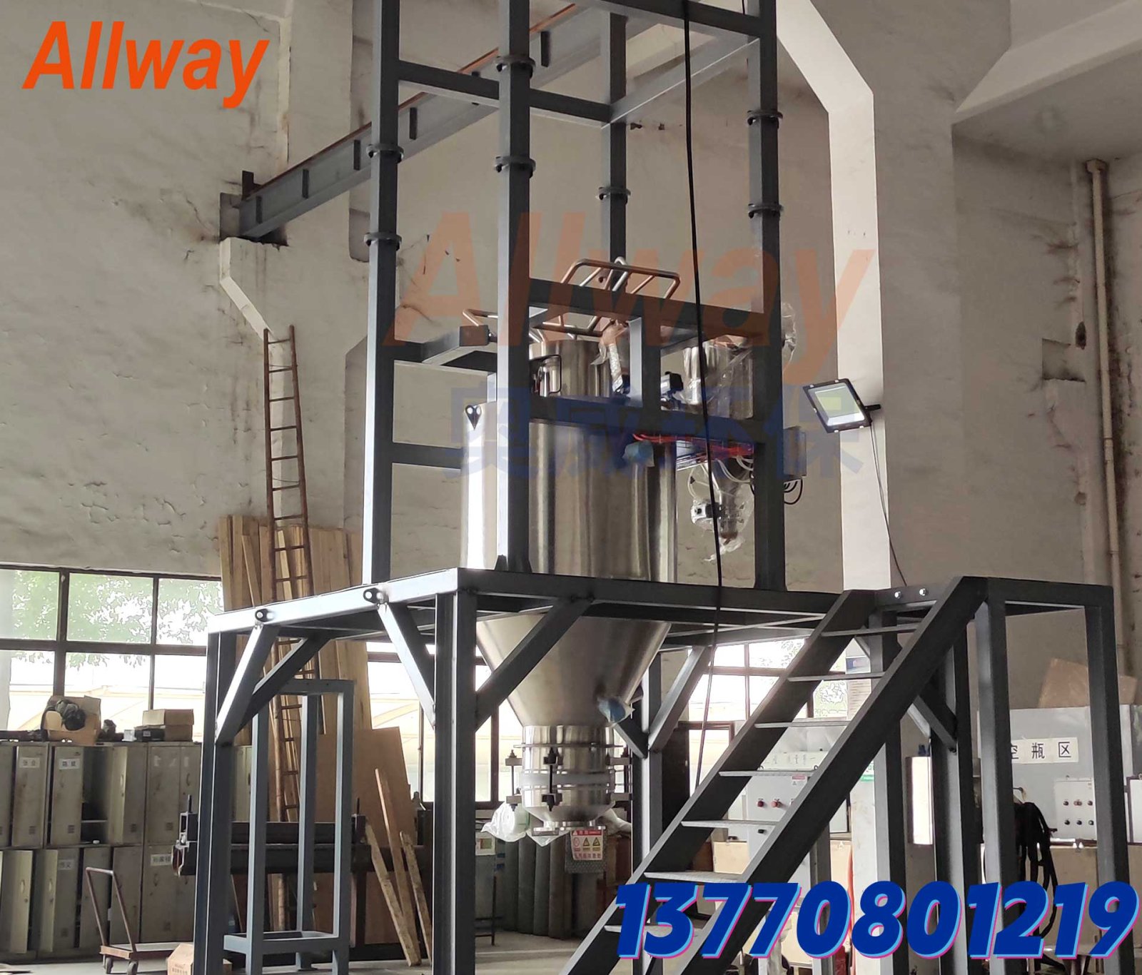 吨袋拆包机用来实现袋装散装物料的卸料功能,为半自动操作。包装袋由电动葫芦提升,包装袋的袋绳挂在钢性支架上,手动操作控制葫芦升降和行走,沿着行走导轨运行到卸料区上方落下,将包装袋放置在支架托盘上,使大袋 处于卸料位置。然后手动打开卸料阀操作门,人工将包装袋的卸料口拉入到卸料阀的系口出,按下系带按钮,卸料阀束紧气缸将袋口锁紧,再手动将大袋的卸料口从卸料位置拉下,罩在卸料口密封箱内的出料管外侧,按下压袋机构气动控制开关,使密封法兰下降,并紧压在出料管的管端,密封卸料通道,以防卸料过程中粉尘漏,接着,人工解袋,*后,关上操作门。手动开启与卸料口密封箱连接的通风除尘管道上的阀门。至此,卸料准备过程结束。