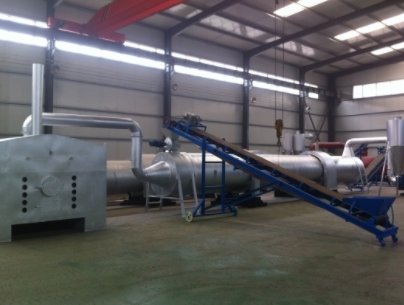 滚筒烘干炉的转筒是略带倾斜并能回转的圆筒体,湿物料从一端上部进入,干物料从另一端下部收集。热风从进料端或出料端进入,从另一端上部排出。