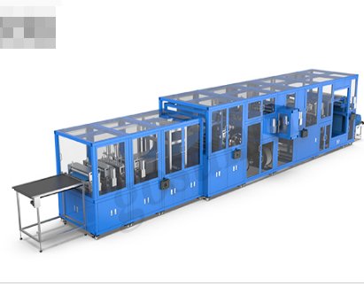 卷料自动进料→SMS布料自动裁切→SMS布料自动喷胶→SMS布料自动贴合→边沿自动折叠焊接→系带自动对折焊接→对折焊接后的系带自动焊到衣身上→领口自动冲切→布料自动折叠→肩膀位自动滚焊→衣身自动滚切→完成