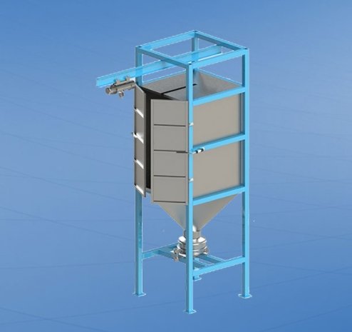 吨袋拆包机用于半自动吨袋拆包,通过电动葫芦或叉车提升吨包至进料口,人工开袋或自动划破袋底(全封闭式),打开吨袋卸料口,并辅以拍打装置落到下方料斗中。