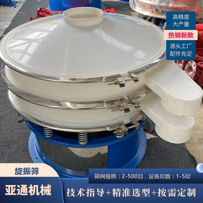 旋振筛又被称为三次元旋振筛,也称作**筛,其噪音低、效率高,快速换网仅需3-5分钟,全封闭结构,适用于颗粒、粉末、粘液等物料的除杂、分级、过滤。可单层或多层使用,高可达5层。