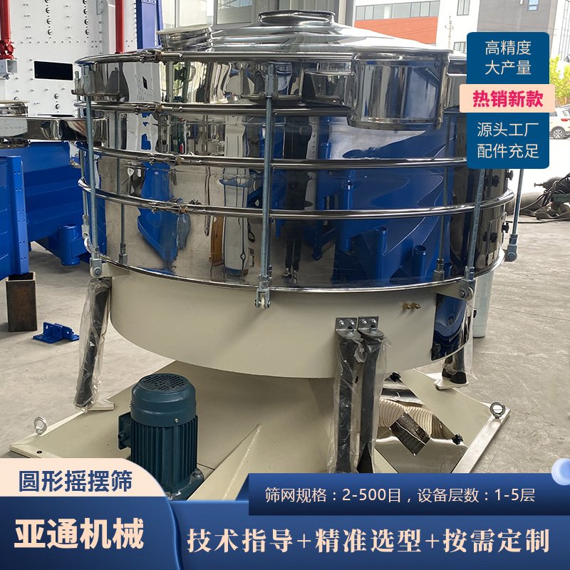 圆形摇摆筛是一种仿人工摇动的低频旋振筛,物料在筛面做非线性的三维运动,既有圆周运动又有上抛弧运动,筛分精度高达90-99%,筛分产量是普通振动筛的5-10倍,可以实现5层分级,适合于适合500目内圆球状、圆柱状、片状乃至不规则形状易堵网且需要精密筛分的物料。