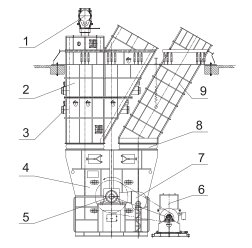 1.进料锁风装置 2.料器体 3.预破装置 4.破碎腔体 5.转动部件 6.传动部件 7.冷却系统 8.膨胀节 9.出料箱