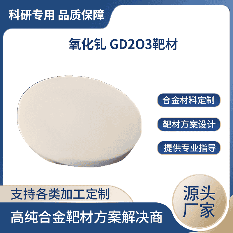 氧化钆 (Gd2O3) 靶材是一种用于物理气相沉积 (PVD) 或化学气相沉积 (CVD) 过程的材料,主要用于制备氧化钆薄膜。氧化钆薄膜在磁性、光学、电子器件等领域具有广泛的应用。