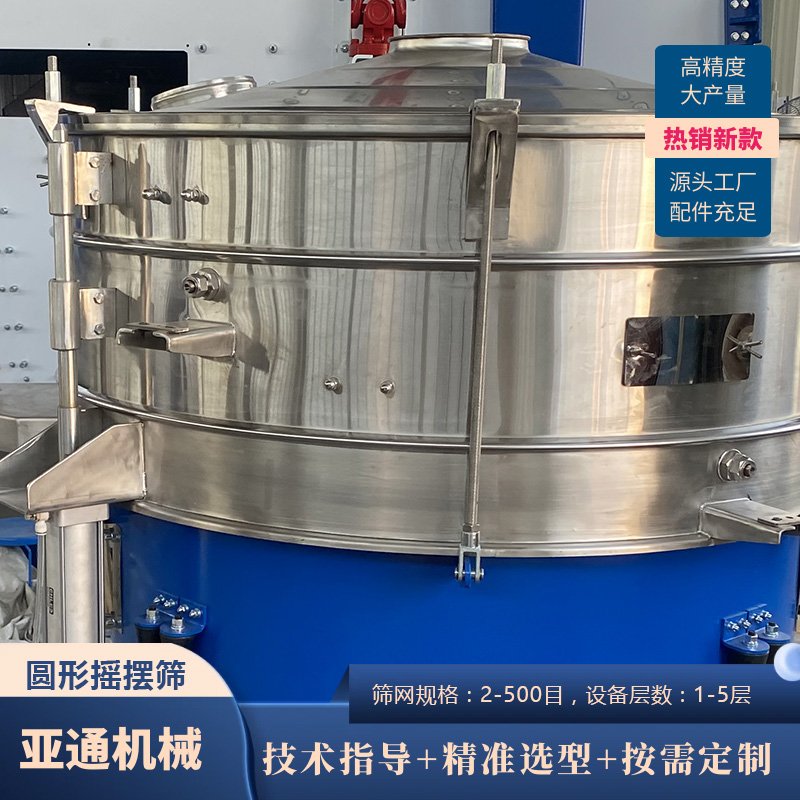 圆形摇摆筛是一种仿人工摇动的低频旋振筛,物料在筛面做非线性的三维运动,既有圆周运动又有上抛弧运动,筛分精度高达90-99%,筛分产量是普通振动筛的5-10倍,可以实现5层分级,适合于适合500目内圆球状、圆柱状、片状乃至不规则形状易堵网且需要精密筛分的物料。