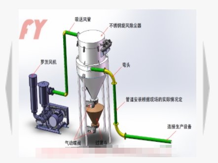 由气源来的低压空气,经调节阀(或减压阀)蝶式止回阀、活动风管、喷嘴进入泵体扩散室内,当粉状或颗粒状物料由落料斗落下进入喷嘴与扩压器之间的高速气流区时,即被吹散。加之底部气化装置的气化作用,使物料气化而成悬浮状态。此后即被高速气流送入扩压器的渐缩管内,流经喉部扩散管,进入输送管路,送至所要求的卸料点,即完成送料过程。