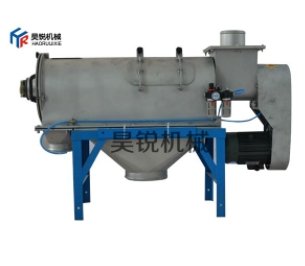卧式气旋振动筛筛网为圆筒状,置于机体内,物料通过螺旋输送系统后,和气流混合、雾化进入网筒内;通过网筒内风轮叶片使物料同时受离心力和旋风推进力,从而能使物料喷射过网,由细料排出口排出,不能过网的物料沿网筒壁从粗料排出口排出。