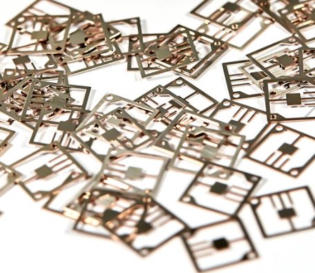 我司在CMC(Cu/Mo/Cu)和CPC(Cu/MoCu/Cu)的工艺基础上,成功开发出可伐/铜/可伐复合带,三层厚度比可调节。后续采用蚀刻或冲压的⼯艺,制备成框架引线。此材料⽐单纯的可伐引线,导热导电性能均⼤幅提高,广泛应用于电子领域。
