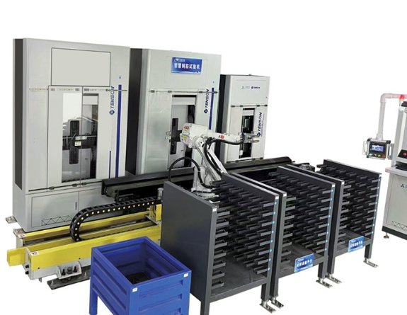 钢筋拉伸强度智能检测系统主要由自动收样系统、移动试样架、激光打标机、AGV智能转运车、6自由度关节机器人、电子**试验机、非接触式引伸计、钢筋称重测长仪、检毕输送线、留样箱、智能控制系统、智慧检测云平台、视频AI识别等组成,可以完成钢筋原材、钢筋机械连接、钢筋对焊的拉伸性能测试。