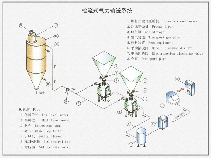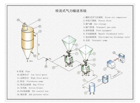 利用气流将进入输料管的密集物料,分割成一段段的料栓,依靠输料管中每段料栓前后的压力差推动物料向前输送。