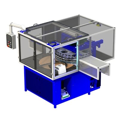工件由两个翻转取放机构运输至圆盘传送带上完成上下料,取放机构安装在两个安装盘上,安装盘可在垂直方向上调整以补偿盘磨损。