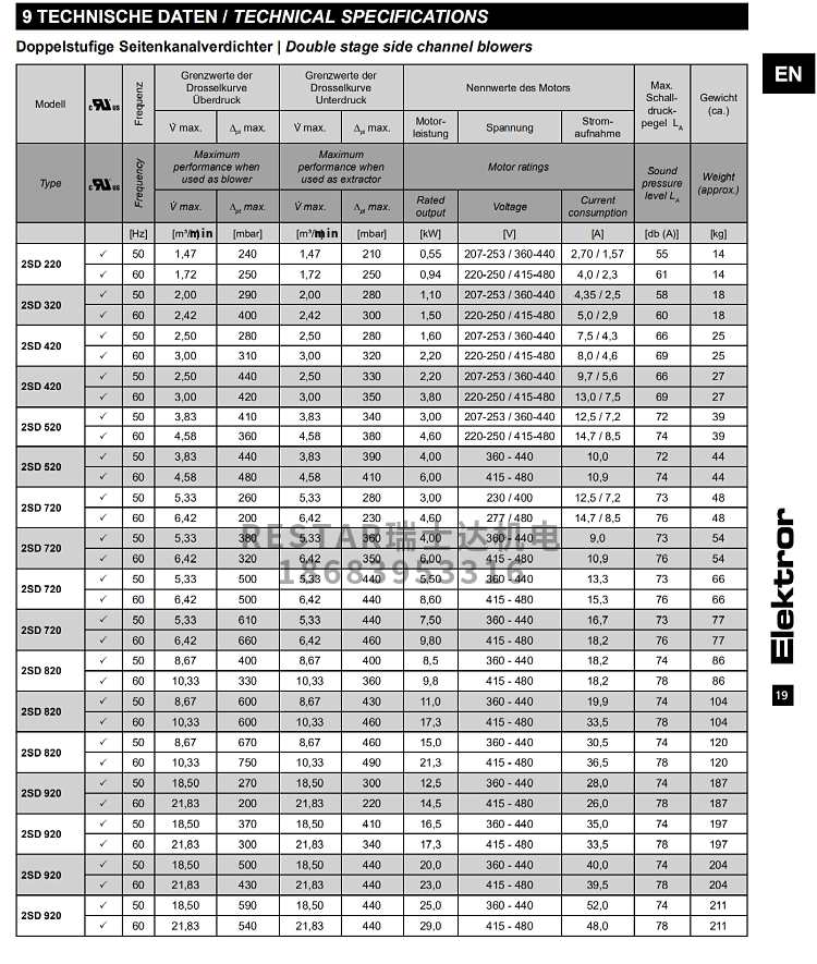 ELEKTROR 依莱克罗风机/真空泵型号说明:双级— 2SD220 2SD320 2SD420 2SD520 2SD720 2SD820 2SD920 2SD740 2SD840 2SD940