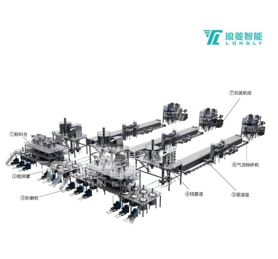 ①粉料仓 ②搅拌罐 ③砂磨机 ④喷雾塔 ⑤辊道窑 ⑥气流粉碎机 ⑦包装机组等