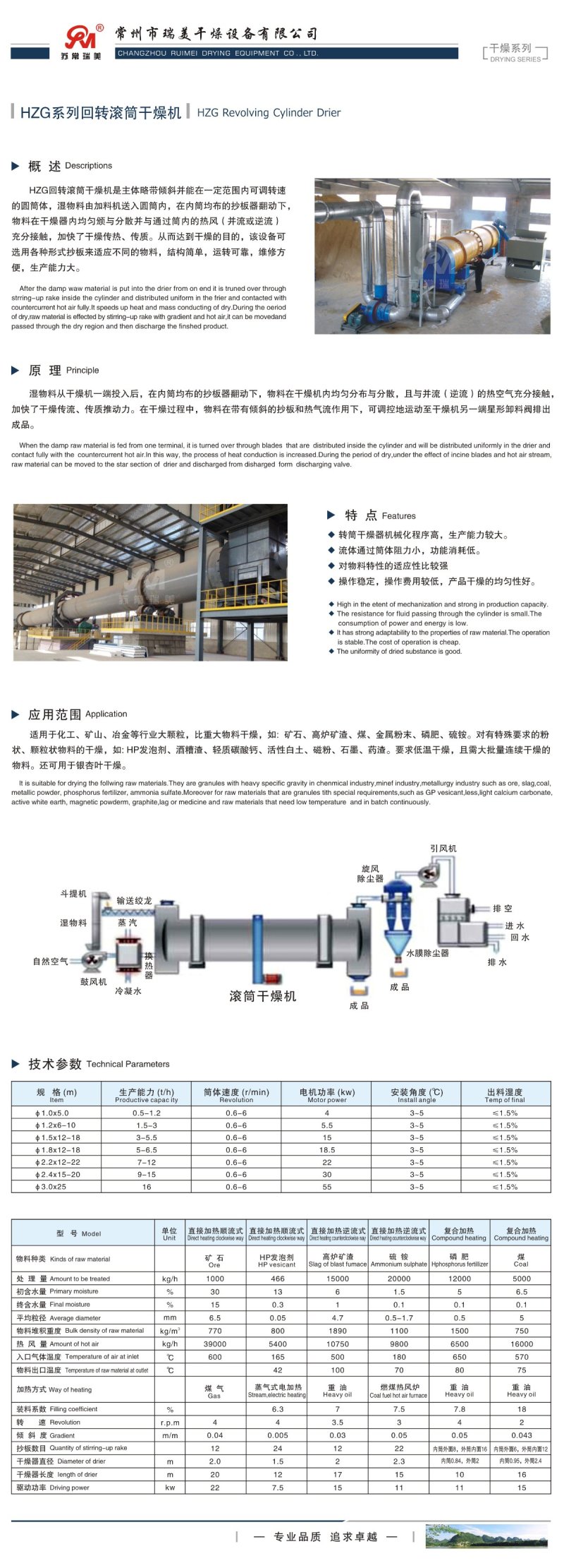 HZG回转滚筒干燥机是主体略带倾斜并能在一定范围内可调转速的圆筒体,湿物料由加料机送入圆筒内,在内筒均布的抄板器翻动下,物料在干燥器内均匀颁与分散并与通过筒内的热风(并流或逆流)充分接触,加快了干燥传热、传质。从而达到干燥的目的,该设备可选用各种形式抄板来适应不同的物料,结构简单,运转可靠,维修方便,生产能力大。