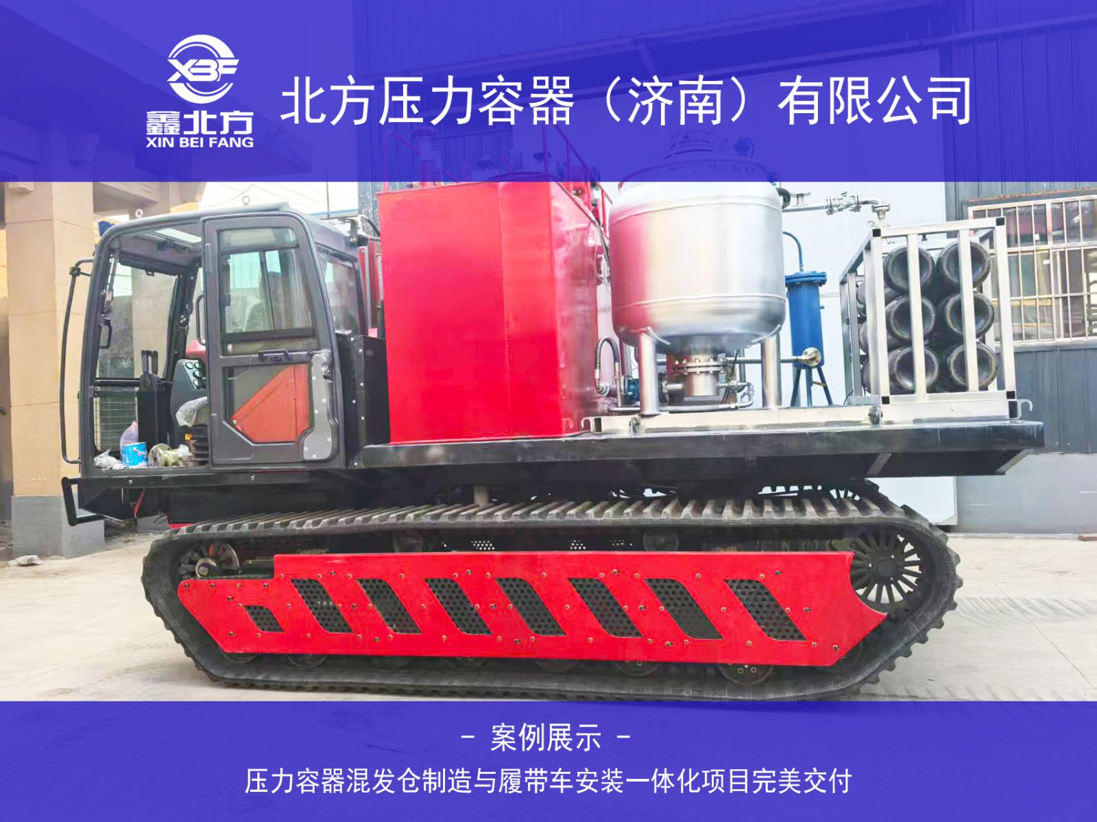 2025年6月6日,在北方压力容器(济南)有限公司位于山东济南章丘区的生产厂区内,一项专为山东省某知名新材料企业定制的特殊材料制备输送的移动式履带车式混发仓工作单元顺利交付。