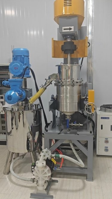 适合如氮化硅等行业,用更少的研磨球,处理更多浆料。浆料通过隔膜泵从研磨缸底部进入,顶部回流至循环缸,细颗粒迅速通过,粗颗粒研磨时间更长,粒度分布窄。
