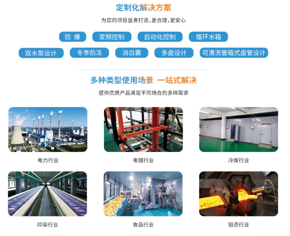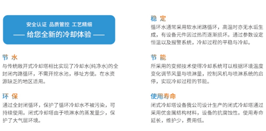 闭式冷却塔将管式换热器霄于塔内,通过流通的空气、喷淋水与循环水的热交换保证降温效果。由于是闭式循环,其能够保证水质不受污染,很好的保护了主设备的高效运行,提高了使用寿命。外界气温较低时,可以停掉喷淋水系统,起到节水效果。