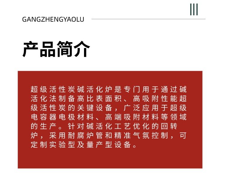 陕西罡正窑炉科技有限公司的GZ-LX 超级活性炭碱活化炉是一款专为高性能活性炭生产设计的核心设备,尤其适用于超级电容活性炭、锂电负极材料前驱体等高端应用场景。