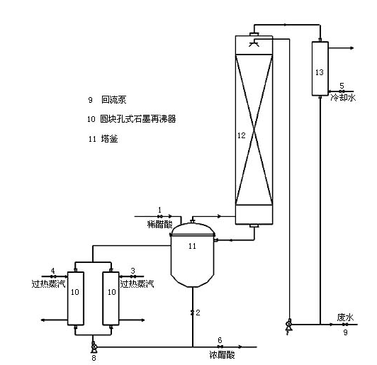本系统采用先进设计理念,将生产过程产生的15%-25%的稀醋酸浓缩到99%,在此过程中使排放的废水达到环保标准。系统主体设备-石墨精馏塔,采用聚四氟乙烯浸渍石墨新型材料制造,整个系统具有工艺先进,操作简便,运行费用少,使用年限长的特点,目前,该系统已在浙江龙盛集团、浙江闰土集团成功运行。