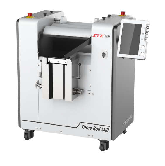 设备三根辊筒(前辊、中辊、后辊)默认采用1:2:3 转速比(可自定义多段配比),辊隙通过双伺服电机调节(精度 ±0.001mm),智能系统(AI 温控、驱动、诊断)全程保障规模化研磨稳定性,核心原理如下: