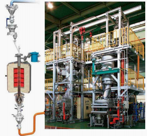 粉末状材料从上方送入并在轴内加热,无需容器即可进行烘烤。