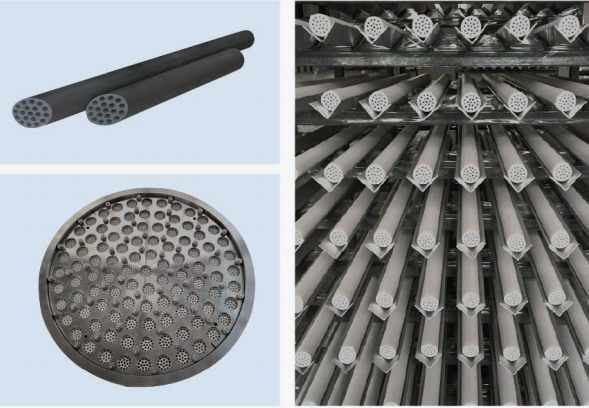 赛利科G系列碳化硅管式膜和氧化铝管式膜是采用重结晶技术通过高温烧结而成。多孔支撑层、过渡层及微孔膜层呈非对称分布,过滤精度为0.04~0.1微米。管式膜过滤系统是一种“错流过滤”形式的流体分离过程,原料液在膜管内高速流动,在压力驱动下含小分子成分的澄清渗透液沿与之垂直方向向外透过膜致密层,含大分子成分的浑浊浓缩液被截留,从而实现流体的澄清、分离、浓缩、提纯的目的。