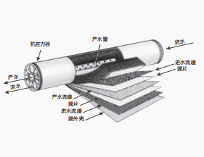 RO反渗透膜孔径小至纳米级(1纳米=10 -9 米),在一定的压力下,H,O分子可以通过RO膜,而源水中的无机盐、重金属离子、有机物、胶体、细菌、病毒等杂质无法通过RO膜,从而使可以透过的纯水和无法透过的浓缩水严格区分开来。