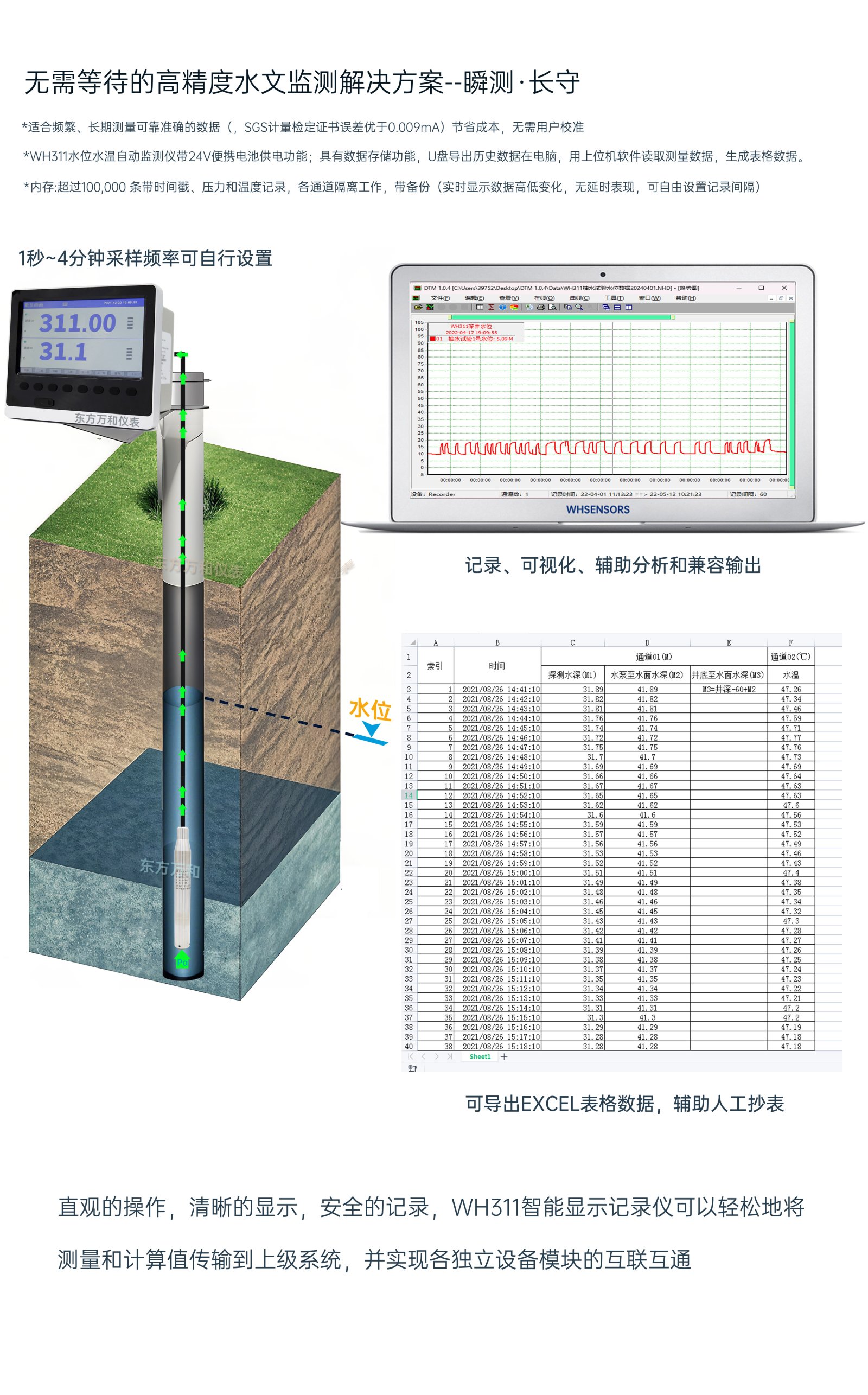 WH311压力式水位水温计|深圳东方万和仪表|温泉井水位水温流量监测方案客户需求场景适用于温泉酒店、地热井等场景,需连续监测温泉井水位(高/低水位)、出水温度及使用流量,实现温泉水资源智能化管理。解决