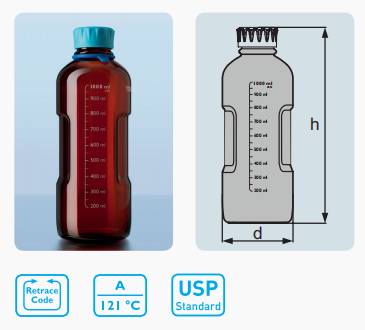瓶身两侧特制的抓握区域设计,使得操作更加便捷且更安全。借助全新的DURAN®YOUTILITY 瓶螺纹开启或闭合功能,开合瓶盖的速度显著提升。该螺纹完全兼容 DIN GL 45 封口件及其他配件。更为纤细的 DURAN®YOUTILITY 瓶身形状,有助于更有效地利用灭菌器及实验室冰箱内的有限空间。预定义的标签区域与专用的 DURAN®自粘式YOUTILITY 瓶标签兼容。标称容量显示在易于读取的分级刻度尺的顶部,便于快速确定容量。玻璃瓶主体由经过反复验证的 DURAN@硼硅酸盐 3.3版药典类型1中性玻璃材料模制而成。DURAN@玻璃具有**的化学稳定性和耐高温性能。每只 DURAN@YOUTILITY 瓶均作为完整系统提供,包含一个注液环(PP)和GL45 盖(PP)。