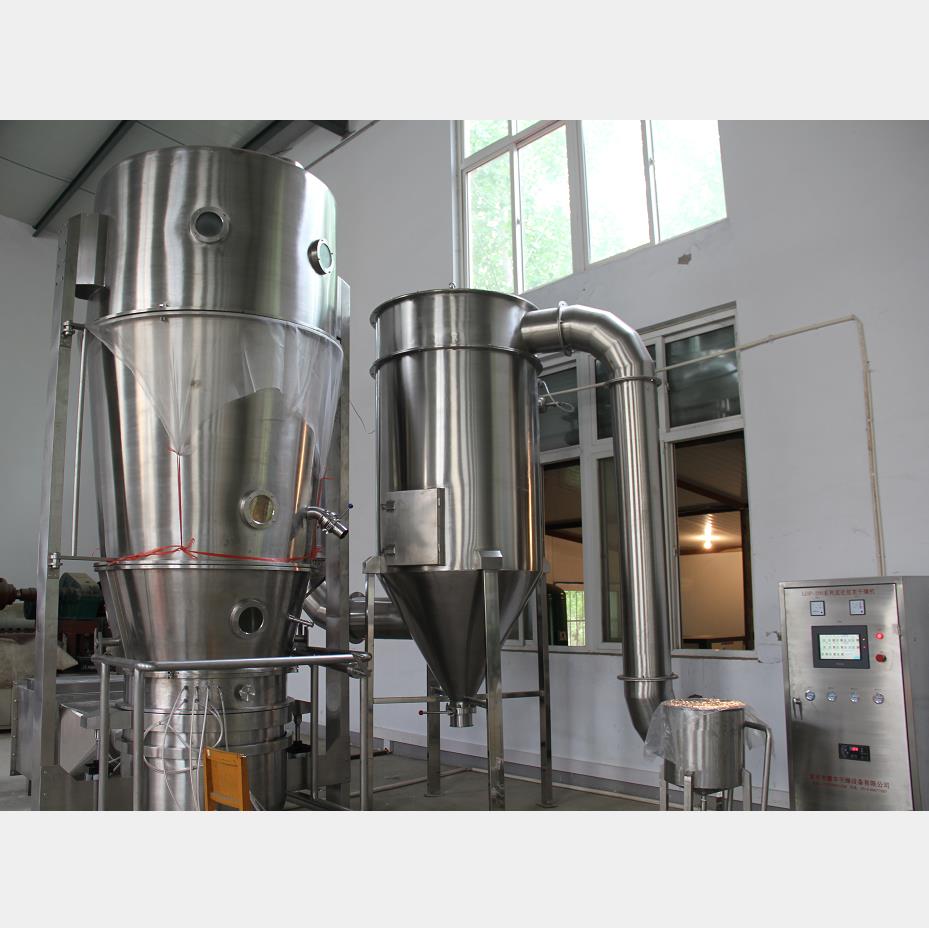 物料粉末粒子,在原料容器(流化床)中呈环形流化状态受到经过净化后的加热空气预热和混合,将粘合剂溶液雾化喷入,使若干粒子聚集成含有粘合剂的团粒,由于热空气对物料的不断干燥,使团粒中水分蒸发,粘合剂凝固,此过程不断重复进行,形成理想的、均匀的多微孔颗粒。