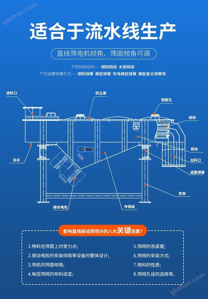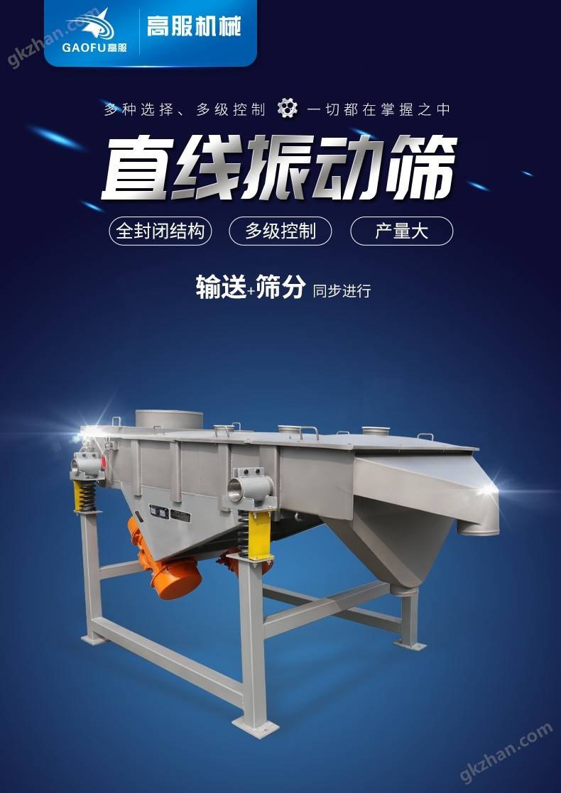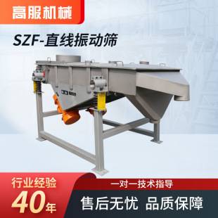 高服机械 混合糖振动筛分设备 食品级专用筛通过两台纵向安装、相对运转的振动电机,抵消横向激振力,纵向激振力带动筛体振动。筛面上物料沿出料口方向跳跃运动,小于筛孔的物料透筛下落,经连续筛分后,可获得多种粒度物料,完成精准分级。