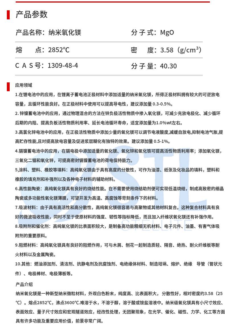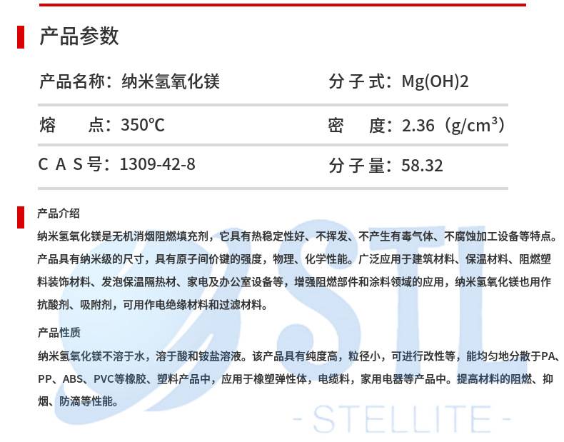 纳米氢氧化镁是无机消烟阻燃填充剂,它具有热稳定性好、不挥发、不产生有毒气体、不腐蚀加工设备等特点。产品具有纳米级的尺寸,具有原子间价键的强度,物理、化学性能。广泛应用于建筑材料、保温材料、阻燃塑料装饰材料、发泡保温隔热材、家电及办公室设备等,增强阻燃部件和涂料领域的应用,纳米氢氧化镁也用作抗酸剂、吸附剂,可用作电绝缘材料和过滤材料。