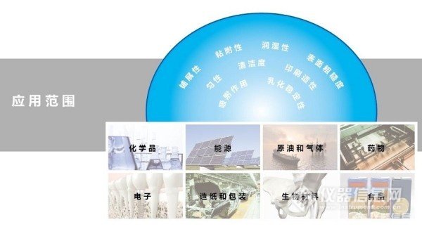 光学接触角测量仪可以记录液滴图像并且自动分析液滴的形状。液滴形状是液体表面张力、重力和不同液体样品的密度差和湿度差及环境介质的函数。在固体表面上,液滴形状和接触角也依赖于固体的特性(例如表面自由能和形貌)。使用液滴轮廓拟合方法对获得的图像进行分析,测定接触角和表面张力。使用几种已知表面张力的液体进行接触角测试可以计算得到材料的表面自由能。