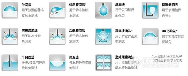 可用测试方法:坐滴法、批处理坐滴法、捕泡法、倒置悬滴法、半月面法、动态接触角(手动)