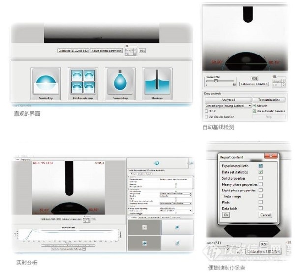 静态接触角、动态接触角、表面自由能(SFE)、表面张力、界面张力、批处理接触角、粗糙度修正接触角、界面流变(粘弹性)