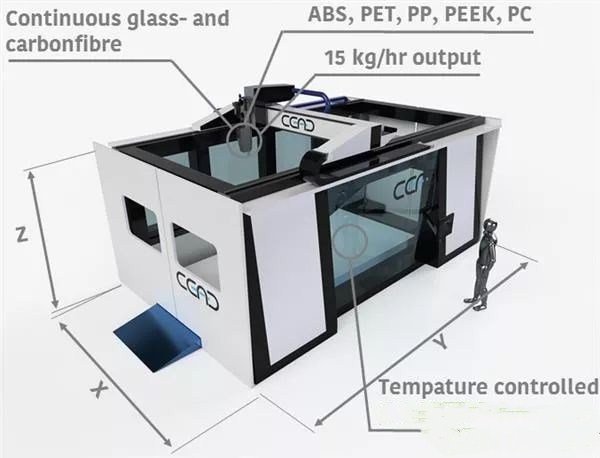 今年1月,CEAD透露了3D打印机的一些关键规格,包括每小时4x2x1.5m的最大构建尺寸和15kg材料的沉积速率。该打印机兼容许多不同的热塑性塑料,包括ABS,PET,PP和PEEK。