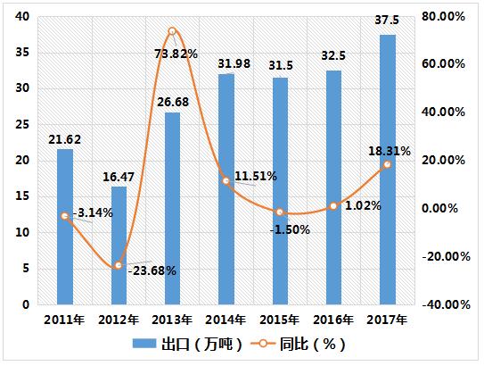 由于碳化硅是资源性商品,2013年以前我国对碳化硅实施出口配额管理制度,抑制了碳化硅的出口。2013年1月1日,商务部取消碳化硅出口配额之后,2013年碳化硅出口量激增,较2012年增长74.13%。2017年我国碳化硅出口量为38.39万吨,同比增长18.71%。日本、美国、韩国为我国碳化硅主要出口国家。