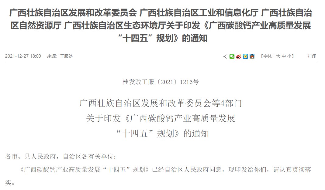 中国粉体网讯 2021年12月,广西壮族自治区发展和改革委员会、工业和信息化厅、自然资源厅、生态环境厅4部门联合印发了《广西碳酸钙产业高质量发展“十四五”规划》(桂发改工服[2021]1216号)。碳酸钙产业是广西重点培育的千亿元产业,推进碳酸钙产业高质量发展,对于积极承接东部产业转移、实现优势资源集约节约利用和绿色发展具有重大意义。