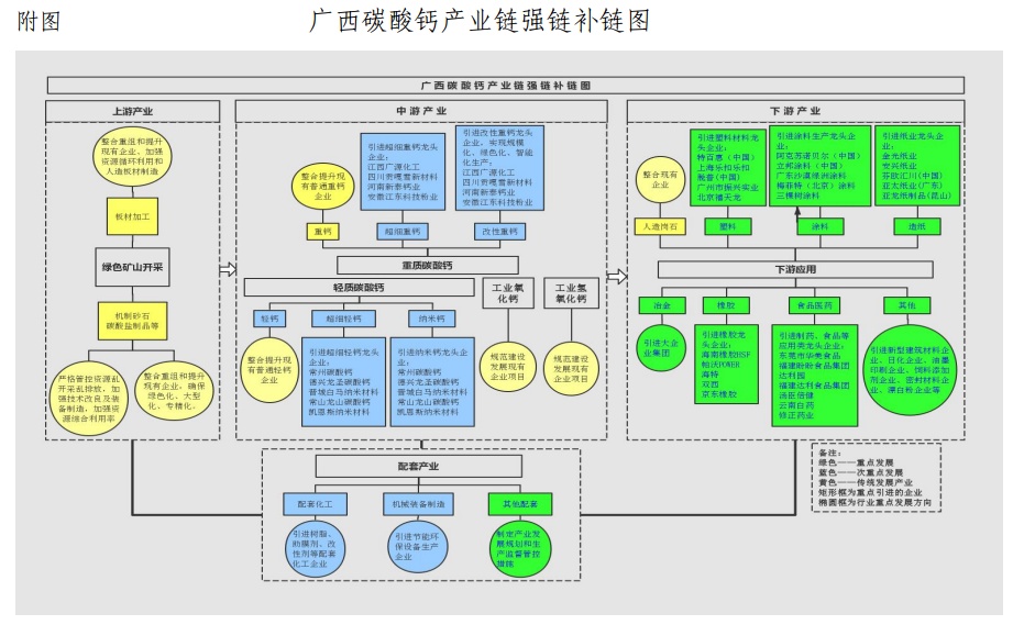 来宾市。重点发展以轻质碳酸钙为主的来宾市碳酸钙产业,进一步优化“一中心五园区”产业布局,加快建设“桂中物流园+钙基新材料生产交易中心”。主动承接大湾区产业转移,建设功能性粉体、健康无机涂料、高分子材料、高端绿色建材、绿色家居整装五大产业链。打造集绿色矿山开采与精深加工产品研发、生产、应用、物流于一体的碳酸钙精深加工生态产业体系。