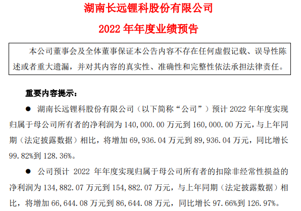 中国粉体网讯 1月3日,长远锂科发布2022年业绩预告,预计2022年年度实现归属于母公司所有者净利润为14亿元到16亿元,与上年同期相比,将增加6.9亿元到8.9亿元,同比增长99.82%到128.36%。