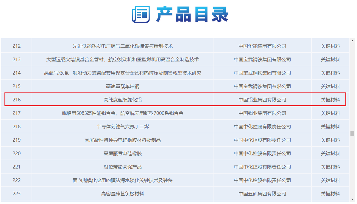 中铝新材料有限公司此次入选中央企业科技创新成果推荐目录(2022年版)的高纯超细氮化铝产品有望助力实现进口替代,解决国家战略性基础材料“卡脖子”难题。目前,公司也是聚焦资源高质高效综合利用,以期按期建成高纯氮化铝示范项目。
