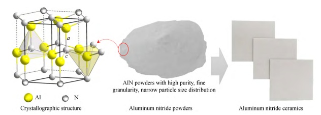 AlN 晶胞结构、粉末及陶瓷基板(来源:何端鹏等,《高热导电绝缘氮化铝陶瓷在宇航器件中的应用:概述、挑战和展望》)