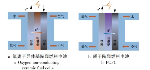 所有的燃料电池单电池都是由电解质、阴极和阳极3部分组成,其中SOFC的电解质、阴极和阳极都是陶瓷材料,因此SOFC又被称为陶瓷基燃料电池。目前SOFC有质子导体电解质和氧离子导体电解质两种形式。