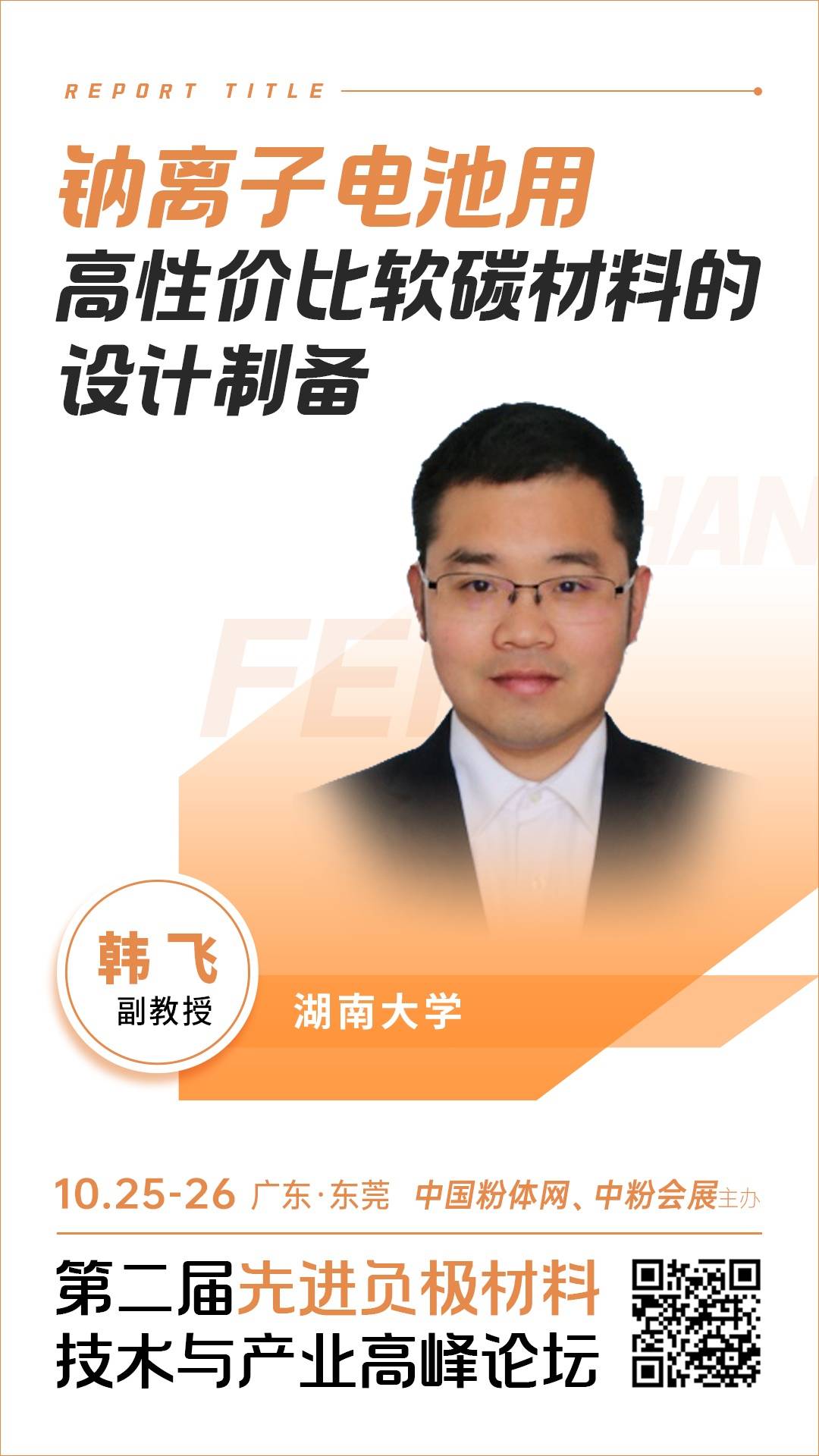 针对各类负极材料的产业化技术与国内外市场状况,中国粉体网将于10月25-26日在东莞举办第二届先进负极材料技术与产业高峰论坛。届时,湖南大学副教授韩飞将作题为《钠离子电池用高性价比软碳材料的设计制备》的报告。报告围绕当前钠电用碳材料的技术研发和产业化布局而展开,分析总结软碳材料在钠电领域的优劣势以及应用现状,将重点介绍沥青基软碳材料、沥青软碳/高分子硬碳复合材料、煤基软碳材料的结构设计、性质调控以及电化学性能,加快软碳材料的产业化推进,促进钠电池的健康发展。