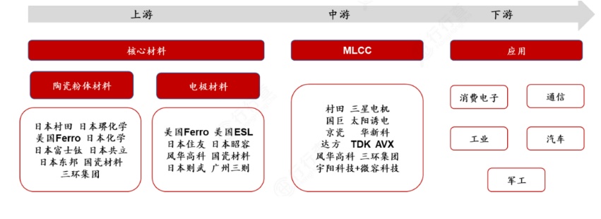 纵观MLCC产业链,其上游为原材料制造环节,包含两类主要原材料,一类是陶瓷粉,陶瓷粉料主要原料是钛酸钡、氧化钛、钛酸镁等;另一类是构成内电极与外电极的镍、铜等金属粉体材料;中游为MLCC制造环节,主要集中在日本、韩国、中国台湾和中国大陆地区。