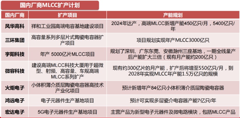 国内厂商高端MLCC产品持续突破。三环集团具有中大尺寸、中高压、特殊品多品类MLCC的量产能力。10月20日,三环推出了MLCC四大产品系列:高强度N系列、高强度C系列、高容高压系列、高频系列;微容科技在超微型008004系列已实现批量供货,容值可达到22nF,与国际前沿的差异只有一步之遥,主流产品性能已可对标日系巨头。风华高科成功自主开发了高容高压材料体系,攻克了均一薄介、异质共烧、层压变形等核心材料应用工艺技术,综合性能达到国际头部企业同等水平。宇阳超微型MLCC填补了国内空白,达到国内领先水平。龙头厂商在工艺方面有长期的经验积累和持续的研发投入,相比后进者在工艺方面更有优势。