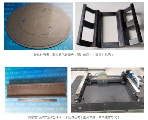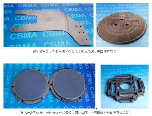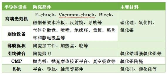 陶瓷是刻蚀机、涂胶显影机、光刻机、离子注入机等半导体关键设备中的关键部件材料,其成本已占半导体设备成本10%以上。其中,碳化硅陶瓷在半导体制造的前段到后段工艺装备中都有广泛应用,例如在研磨抛光吸盘、光刻吸盘、检测吸盘、精密运动平台、刻蚀环节的高纯碳化硅部件、封装检测环节中精密运动系统等等,地位极其重要。