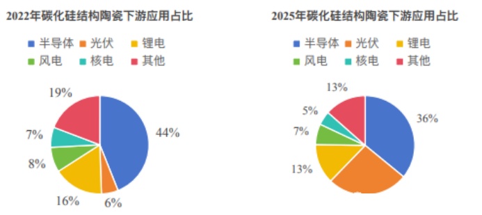 终端旺盛装机需求持续带动电池片需求高增,推动光伏产业碳化硅舟托及舟盒替换需求上涨,预计到2025年半导体及光伏行业用碳化硅结构陶瓷占比达62%,其中光伏行业用碳化硅结构陶瓷占比将从2022年6%上升至26%,成为最快增长领域。