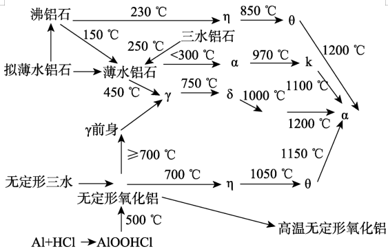 氧化铝的各种晶型之间的关系,通常,α-氧化铝被认为是晶型稳定的氧化铝,而其他晶型的氧化铝则被认为是α-氧化铝的中间过渡形态