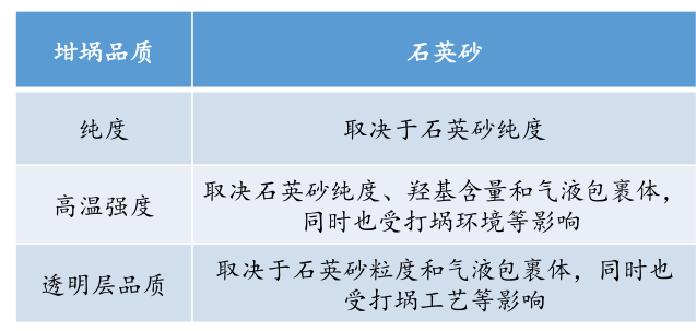 石英坩埚的寿命是其综合品质的体现,其中,纯度保证了坩埚不会形成太厚的析晶层,高温强度保证了坩埚长时间运行不变形塌边,透明层品质保证了拉晶过程的顺畅、不断线。而石英砂的纯度、羟基含量、气液包裹体及石英砂的粒度都等影响着石英坩埚的品质。